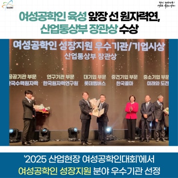「2025 산업현장 여성공학인대회」에서 여성공학인 성장지원 분야 우수기관 선정 원자력연구원이 「2025 산업현장 여성공학인대회」에서 여성공학인 성장지원 분야 우수기업으로 선정돼 산업통상부 장관상을 수상했다. 여러 연구기관 후보를 제치고 우수한 평가를 받아 연구원이 최종 선정됐다. 이번 대회는 산업통상부가 주최하고 한국여성공학기술인협회가 주관해 11월 17일 서울 엘타워에서 열렸다. 여성공학인의 산업계 진출 확대와 역할 강화를 위해 마련된 행사로, 여성공학인 관련 주요 인사 200여 명이 참석했다. 연구원은 그간 여성 채용·재직 목표를 설정해 체계적으로 관리하고, 여성친화적 채용 제도 운영, 여성과학기술인 담당관 지.......