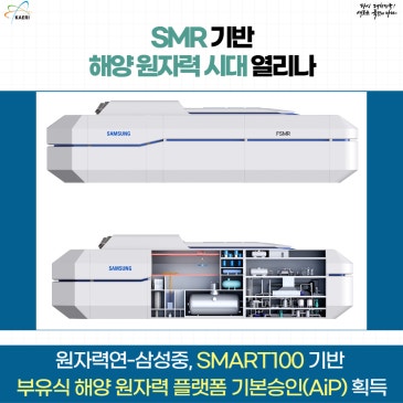 원자력연-삼성중, SMART100 기반 부유식 해양 원자력 플랫폼 기본승인(AiP) 획득 원자력연구원은 삼성중공업이 SMART100을 기반으로 한 부유식 해양 원자력 플랫폼(FSMR, Floating SMR)에 대해 미국선급(ABS)으로부터 기본승인(AiP, Approval in Principle)을 지난 10월 24일 획득했다고 16일 밝혔다. SMART100은 원자력연구원이 개발한 국내 최초의 완전 피동형 소형모듈원자로(SMR)이며 2024년 표준설계인가를 획득한 경수형 SMR로, 검증된 기술을 바탕으로 바로 건설 가능한(Ready for Market) 수출형 원자로이다. AiP는 선급이 신규 선박의 설계나 기술을 검토해 국제규정과 안전기준의 충족 여부를 확인하고, 실제 선박 개발로 나아가기 위.......