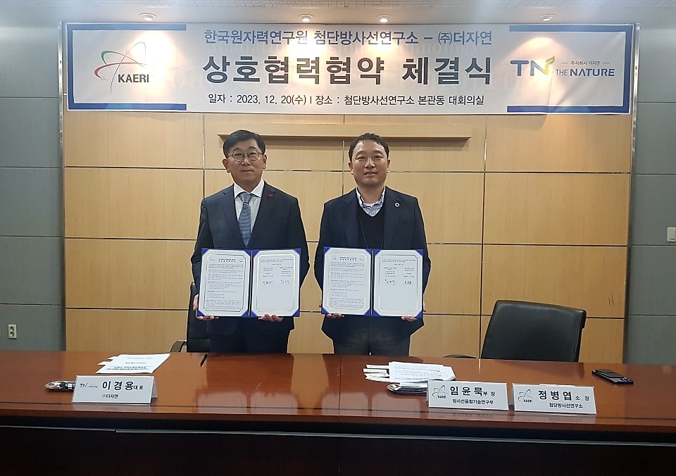 □ 한국원자력연구원(원장 주한규) 첨단방사선연구소(소장 정병엽)는 방사선기술을 활용한 친환경 바이오매스 기반 산업소재 생산 및 제조 기술 분야 협력을 강화하고 상호발전을 도모하기 위해 12월 20일 KAERI-Family 기업인 ㈜더자연(대표 이경용)과 협약을 맺었다.