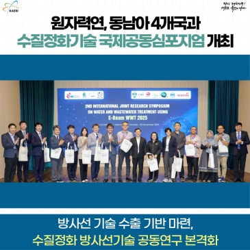 방사선 기술 수출 기반 마련, 수질정화 방사선기술 공동연구 본격화 원자력연구원은 과학기술정보통신부의 원자력국제공동연구지원사업의 일환으로 인도네시아, 태국, 베트남, 필리핀 4개국과 함께 ‘전자선기반 수질정화기술 국제공동심포지엄(International Joint Research Symposium on Water and Wastewater Treatment using E-beam Technology)’을 10월 29일부터 5일간 베트남 호치민에서 개최했다고 30일 밝혔다. 심포지엄에는 원자력연구원을 비롯해 인도네시아 국가연구혁신청(BRIN), 태국 원자력연구소(TINT), 베트남 원자력연구소(VINATOM), 필리핀 원자력연구소(PNRI) 등에서 온 전문가 40여 명이 참석했다. 참가자들은 각국의 방사.......