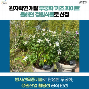 방사선육종기술로 탄생한 무궁화, 정원산업 활용성 공식 인정 원자력연구원 첨단방사선연구소에서 개발한 무궁화 ‘키즈 화이트’ 품종이 한국수목원정원관리원이 주최하고 국립세종수목원에서 열린 ‘2025 대한민국 정원식물 전시·품평회’에서 국내육성품종 분야 올해의 정원식물로 선정됐다고 9월 25일에 밝혔다. 이번 전시·품평회는 ▲자생식물 ▲국내육성품종 ▲국외도입품종 3개 분야로 진행됐으며, 정원 분야 민·관·학 전문가가 참여한 전문가 품평(70%)과 사전 모집된 일반인의 국민 품평(30%)을 합산해 최종 선정됐다. ‘키즈 화이트’는 종합·색상·질감·활용성·신규성 5개 시상 부문 중 활용성 우수를 인정받아 한국수목원정원관리원 이.......