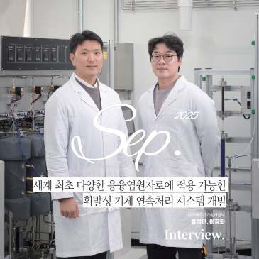 "세계 최초로 다양한 용융염원자로(MSR)에 적용 가능한 장기 운전 안전성 확보용 휘발성 기체 연속처리 시스템 개발"로 2025년 9월 KAERI 우수성과에 선정된 선진핵주기기술개발부의 인터뷰를 싣습니다. 용융염원자로* 운전 중 발생하는 대표적인 방사성 기체** 제논(Xe)을 제거하고, 분위기 기체***인 헬륨(He)을 재사용 할 수 있도록 회수하는 진공압력변동흡착(VPSA)**** 기반의 연속 정화 시스템을 구축했어요. * 용융염원자로: 고체 핵연료 대신 액체 상태의 용융염에 핵연료를 녹여 사용하는 차세대 원자로 ** 방사성 기체: 방사선을 내뿜는 기체 상태의 물질로, 원자로에서 핵분열 시 생성됨 *** 분위기 기체: 공정에서 산화나.......