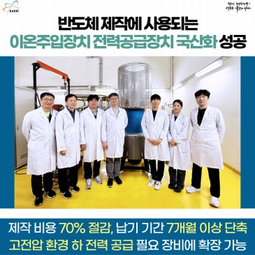 제작 비용 70% 절감, 납기 기간 7개월 이상 단축 원자력연구원 양성자과학연구단은 반도체와 첨단 소재 제작에 사용되는 이온주입장치의 고전압 환경에서도 안정적으로 전력을 공급할 수 있는 절연형 모터제너레이터(Motor-Generator Set, MG-SET)를 독자 개발하는 데 성공했다고 3월 17일 밝혔다. 이온주입 기술은 반도체 및 첨단 소재 제작 분야에서 널리 사용되는 핵심 공정이다. 수만~수십만 볼트(V) 수준의 높은 전압으로 이온을 가속해 소재 내부로 주입한다. 이를 통해 소재의 전기적 특성이나 표면 성질을 원하는 방향으로 조절할 수 있다. 이온주입장치는 고전압 상태에서 작동하기 때문에, 수백 볼트 수준의 일반적인 외부 전원과 직접.......