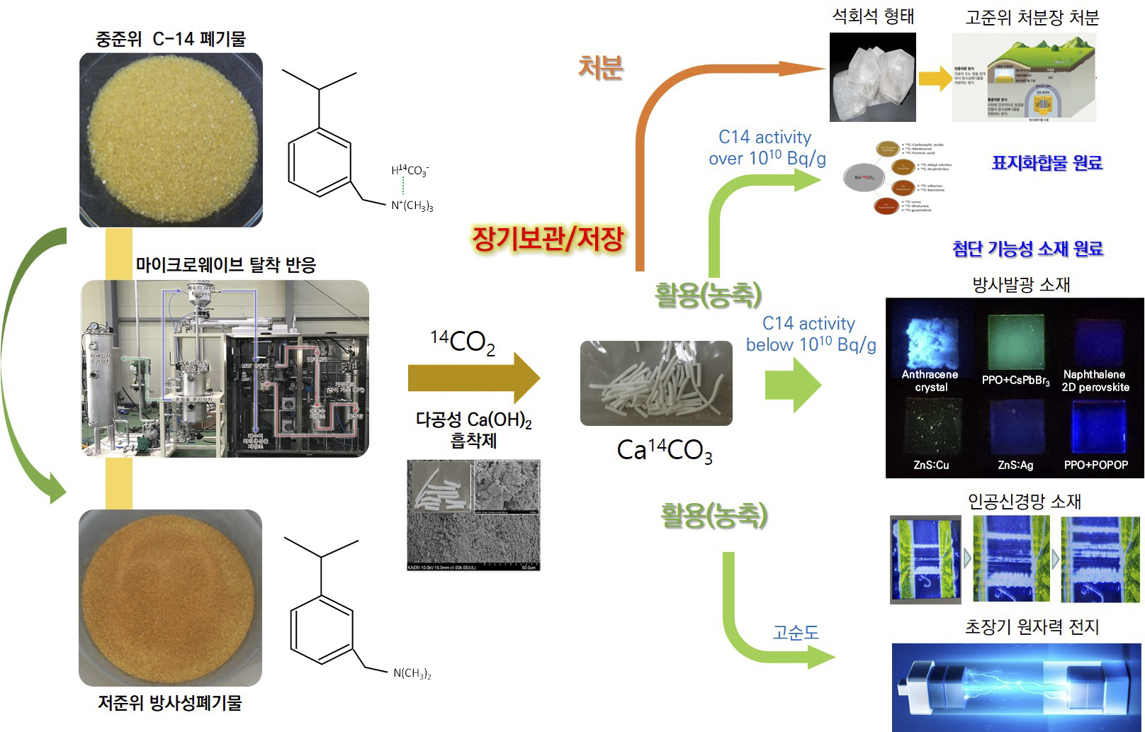 ㅇ 이에 선진핵주기기술개발부 박환서 박사 연구팀은 산이나 화학물질 투입 없이 마이크로파를 이용해 C-14를 짧은 시간에 탈착해 고농도로 회수할 수 있는 원천기술을 개발했다. 이를 통해 중준위폐기물의 방사능을 약 1/100이하로 저감하여 저준위화 하고, 고가의 동위원소인 C-14를 약 100배 이상 고농도로 회수할 수 있어 약 1조 원의 부가가치를 창출할 수 있다.
