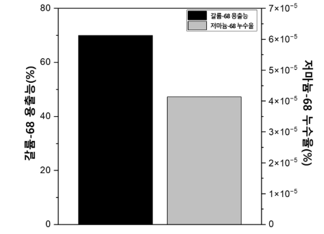 설명 : 갈륨-68 발생기의 품질기준 용출 효율 70% 이상과 원료물질 누수율 0.001% 이하를 만족하는 성능지표를 나타낸 그림