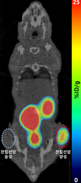 설명 : 전립선암 음성 대조군과 달리, 우측 허벅지의 양성 실험군의 종양 부위에만 갈륨-68 방사성의약품이 선택적으로 집적되며 갈륨-68 발생기의 유효성을 성공적으로 검증