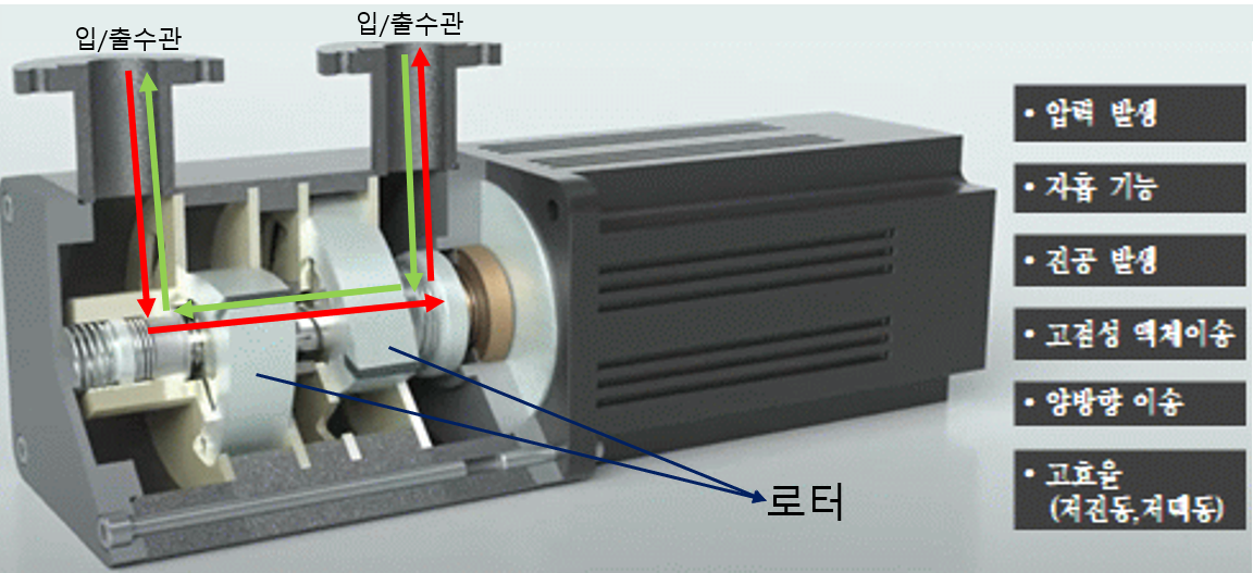 ㅇ 이 기술은 원통형 구조 내부에서 로터(회전체)가 회전하며 유체를 흡입·가압·이송하는 방식이다. 로터가 회전하면서 내부 공간이 넓어지면 압력이 낮아져 외부의 유체가 들어오고, 공간이 좁아지면 압력이 높아지면서 유체가 밀려 나가는 원리를 이용한다.