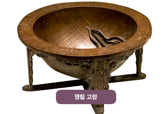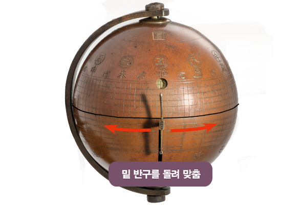 그 후에는 좌우 회전이 가능한 아래쪽 반구를 돌려 태양 쪽으로 맞춘다. 아래쪽 반구에는 태양이 비춰서 그림자를 낼 수 있는 영침(影針·일종의 시계침)이 설치되어 있다. 그 영침에 비친 태양의 그림자가 홈(길게 난 구멍) 속에 쏙 들어가 보이지 않게 맞추면 측정 준비는 끝이다. 그런 뒤 영침을 위로 올리면 영침이 가리키는 위쪽 반구에 표시된 12지 시간표시가 시간을 알려준다. 그리고 그 밑에 뚫린 구멍(시보창) 속에서 역시 12시진이 새겨진 시각표시(시패·時牌)가 ‘까꿍’하고 나타난다.
