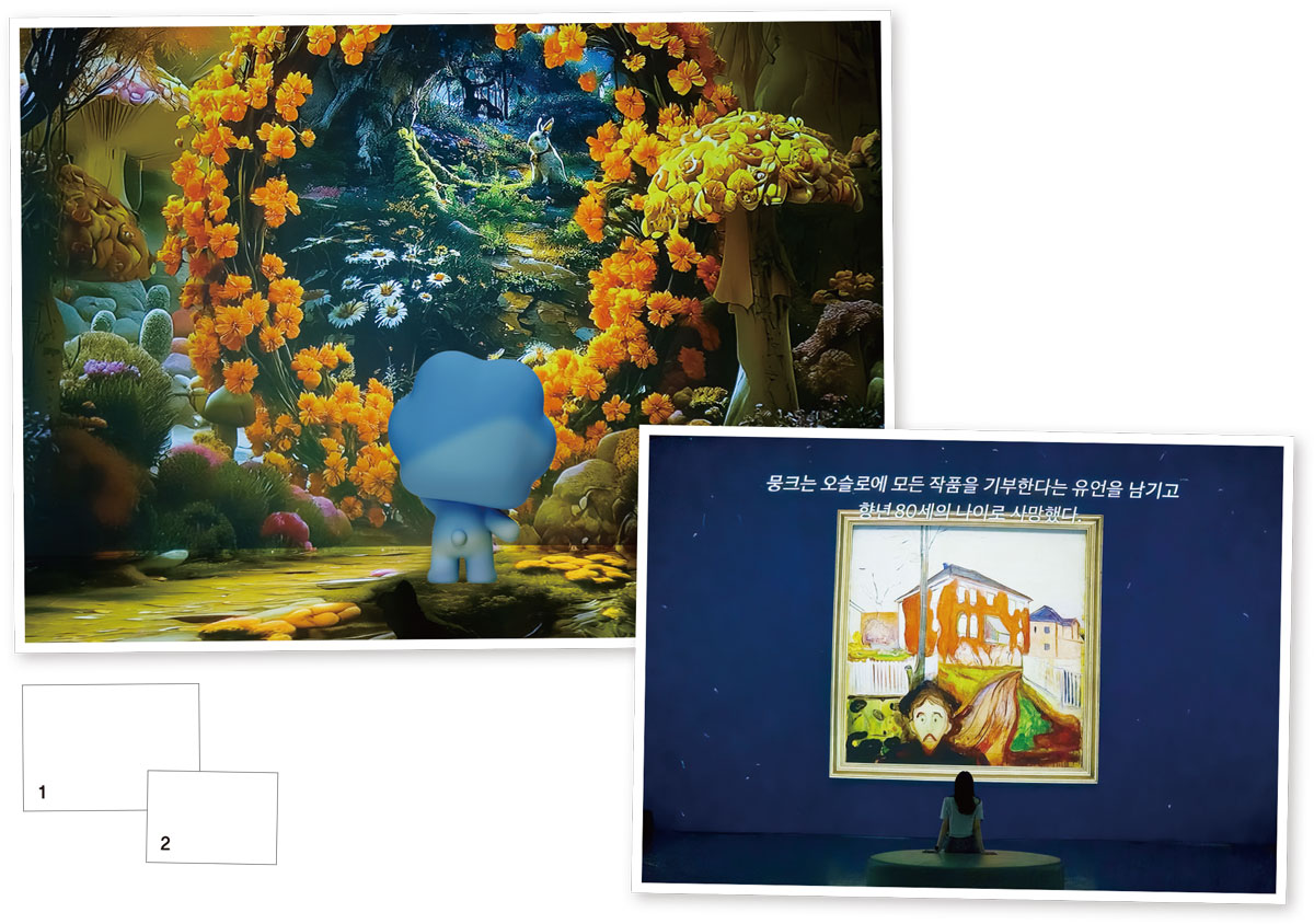 1관의 여운을 잠시 즐기다 2관으로 넘어갔어요. 2관은 오페라 극장으로 특별 상영이 진행되고 있었죠. 상영 시간표를 확인해 보았는데요. 상영시간이 30분이기 때문에 시간표를 미리 확인한 뒤 관람 동선을 짜면 좋아요. 지금은 ‘뭉크: 어둠의 저편’ 전시가 진행되고 있었어요. 인간의 불안과 고독, 죽음, 사랑의 감정을 강렬하게 표현했던 뭉크. 유년 시절 경험한 상실과 질병 때문일까요? 그의 작품은 독특한 분위기를 자랑하죠. 자리에 앉으면, 전시관의 벽면뿐 아니라 천장까지 커다란 스크린이 되어 상영됩니다. 그 규모가 웅장해서 파동이는 입을 벌리고 정신없이 감상했어요. 뭉크의 대표적인 작품, ‘절규’만 익숙했던 터라 그의 다른 작품들을 처음 감상해 보았는데요. 새롭기도 하고, 작품에 압도되는 기분을 느꼈어요. 자신의 상처를 예술로 승화할 수 있다는 것은 예술가의 특권이지 않을까 생각해 보게 되었답니다.