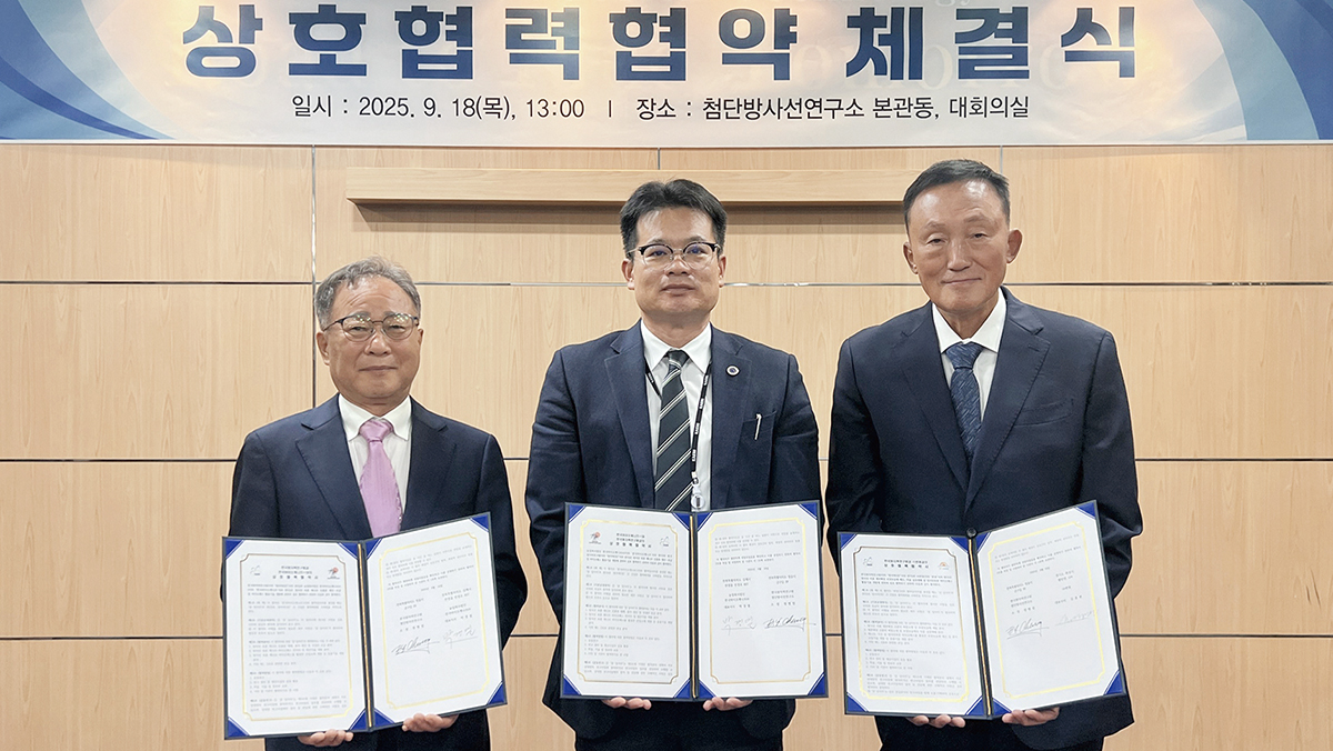 한국원자력연구원이 한국바이오케나프㈜, ㈜썬원과 방사선 육종 케나프 산업화 기술협력 업무협약을 체결했다.