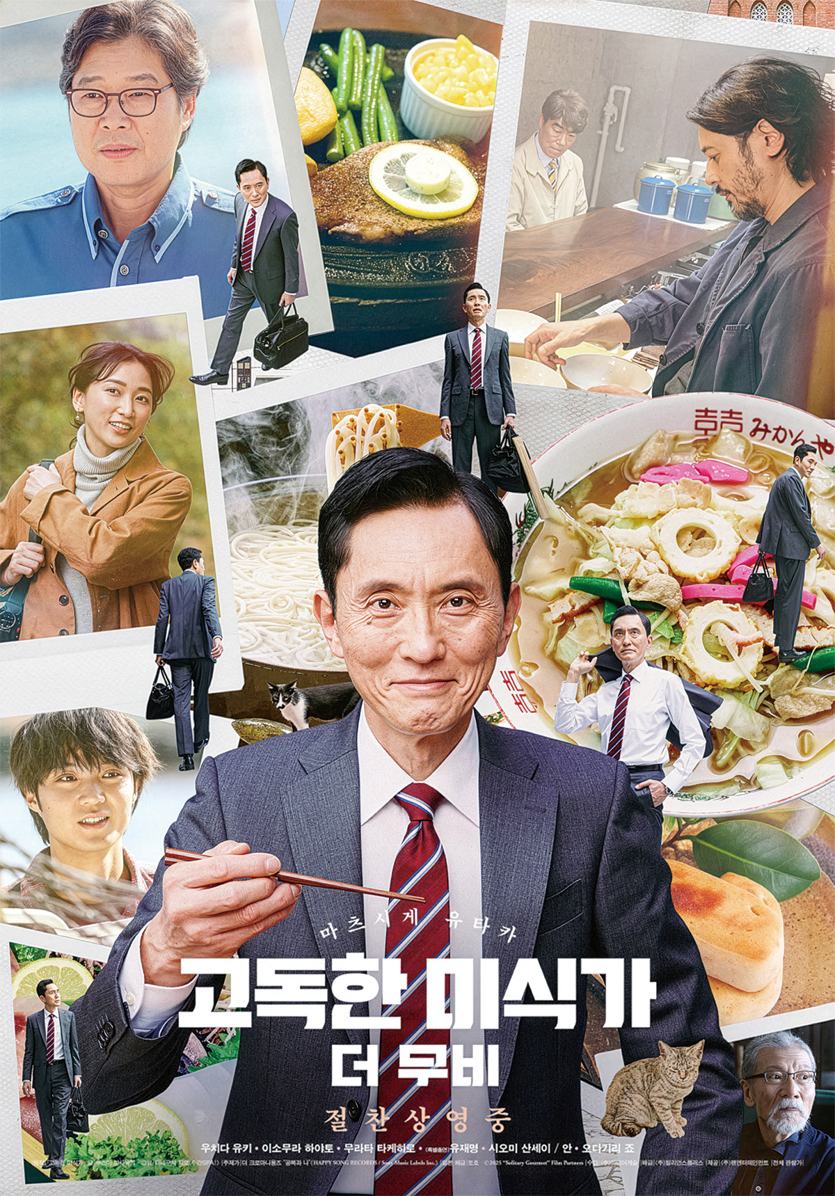 2025년에는 테레비 도쿄 개국 60주년 기념으로 극장판 <고독한 미식가 더 무비>가 나왔는데, 드라마 주인공 고로를 연기한 마스시게 유타카가 각본, 감독, 주연을 맡았다. 옛 애인의 딸에게 의뢰를 받고 파리를 찾은 고로는 고픈 배를 프랑스 음식으로 채운 후, 의뢰인의 집을 방문한다. 거기서 귀향을 포기한 노인으로부터 어릴 때 어머니가 만들어 주신 국물을 찾아달라는 간절한 부탁을 받는다. 단서는 이름이 ‘잇짱지루’이며 육고기, 생선, 해조류와 채소로 만든 감칠맛이 있는 순하고 훌륭한 음식이었다는 것이다. 마음 약한 고로는 팔자에도 없는 음식 재료 찾아 삼만 리를 펼친다.