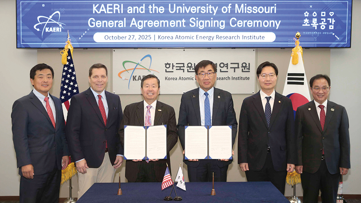 지난 10월 27일, 연구원 본원에서 원자력연구원과 미국 미주리대학교 간 원자력 연구개발 협력 약정을 체결했다. 이번 약정은 지난 4월 미주리대 연구로 설계 수출 이후 양국 간 협력을 제도화한 것으로, 원자로 기술·계측 시스템·방사성동위원소·중성자빔·재료·첨단 컴퓨팅 6개 분야에서 공동연구와 인력 교류를 추진할 예정이다.