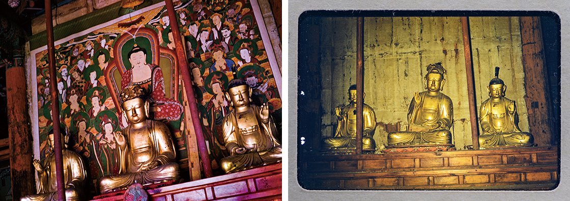 1954년 5~6월 미군통신장교인 폴 뷰포드 팬처가 찍은 설악산 신흥사 극락보전의 내부 모습(왼쪽 사진)과 같은 해 10~11월 미 해병 중위인 리처드 브루스 락웰이 찍은 극락보전 내부 모습(오른쪽). / 속초시립박물관 제공
