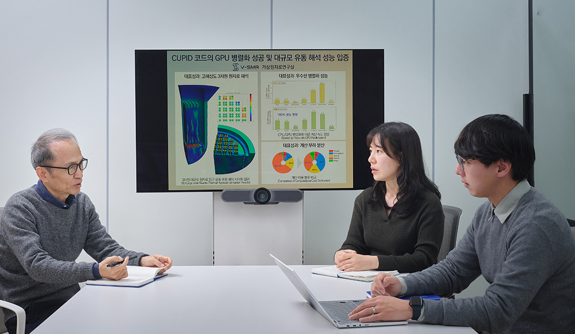 KAERI 인(人)사이드는 우수성과 과제 참여 연구자를 만나는 코너입니다. 연구와 관련된 일화부터 연구원들의 일상까지 다양한 이야기를 들어봅니다. 두 번째로 ‘CUPID 코드의 세계적 수준 GPU 병렬화 성공 및 대규모 유동 해석 성능 입증’이라는 우수성과를 달성한 가상원자로연구실의 박익규 책임연구원과 김일진, 박소현 선임연구원을 만나보았습니다.