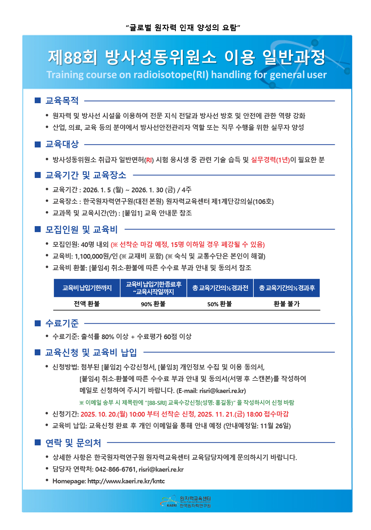 [접수마감] 제88회 방사성동위원소 이용 일반과정 (RI일반면허 실무경력 1년 인정 교육)