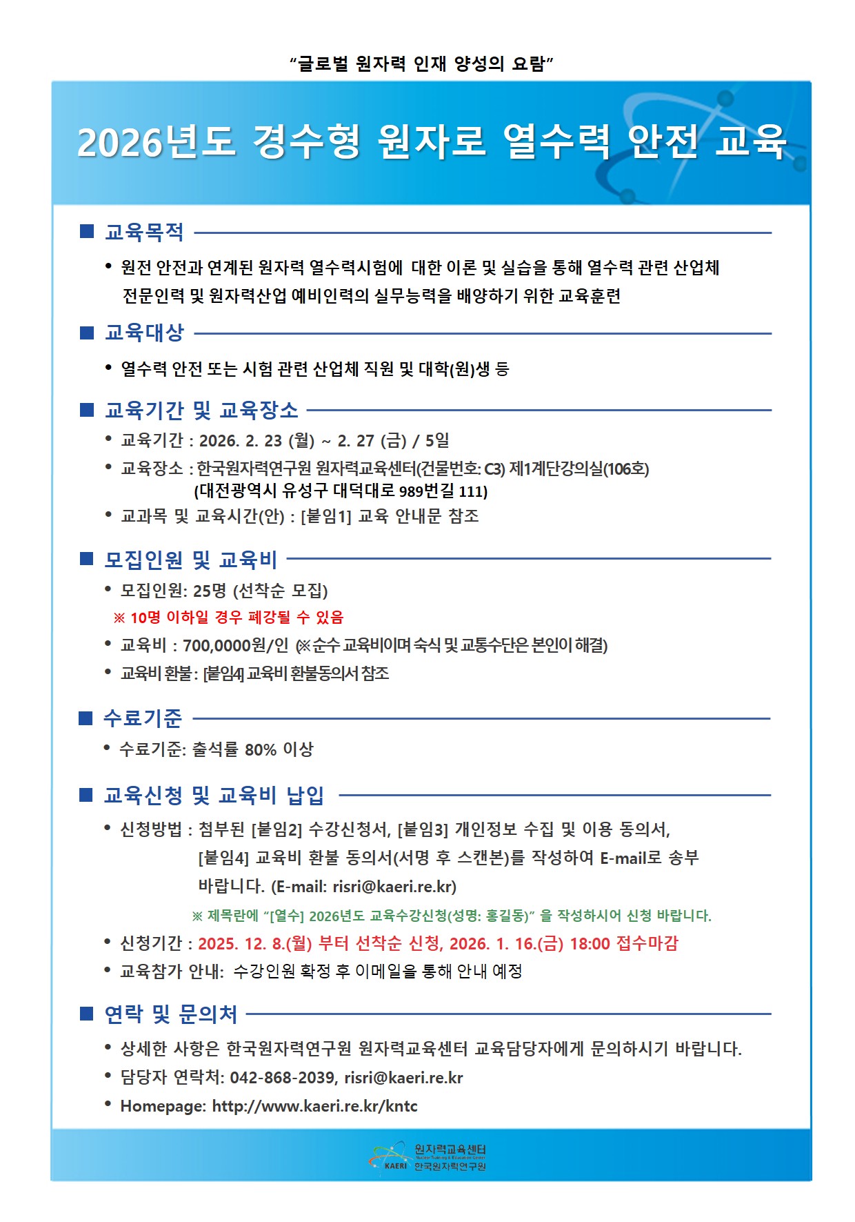 공지사항 10 2026년도 경수형 원자로 열수력 안전 교육 ㄷ 2025.12.02 조회수 14 Tag #원자력발전소 #원자력 #원자로 #경수로 #열수력 #안전 #교육 파일 [붙임1]_2026년도_경수형원자로열수력안전교육_안내문.hwp 98.5KB 다운로드 [붙임2]_2026년도_경수형원자로열수력안전교육_수강신청서(성명 홍길동).hwp 70.5KB 다운로드 [붙임3]_2026년도_경수형원자로열수력안전교육_개인정보_수집_및_이용에_관한_동의서(성명 홍길동).hwp 54.5KB 다운로드 [붙임4]_2026년도_경수형원자로열수력안전교육_교육비_환불_안내_및_동의서(성명 홍길동).hwp 57.5KB 다운로드 이전 다음 목록