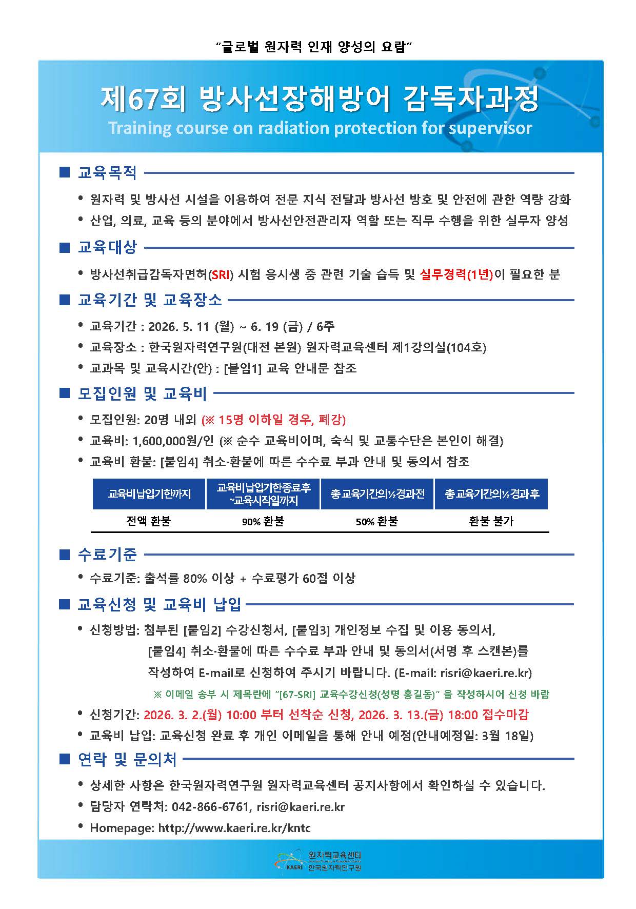 교육 관련 문의사항이 있으실 경우, risri@kaeri.re.kr 또는 042-866-6761(업무시간 10:00 ~ 16:00, 평일)으로 연락주시기 바랍니다.